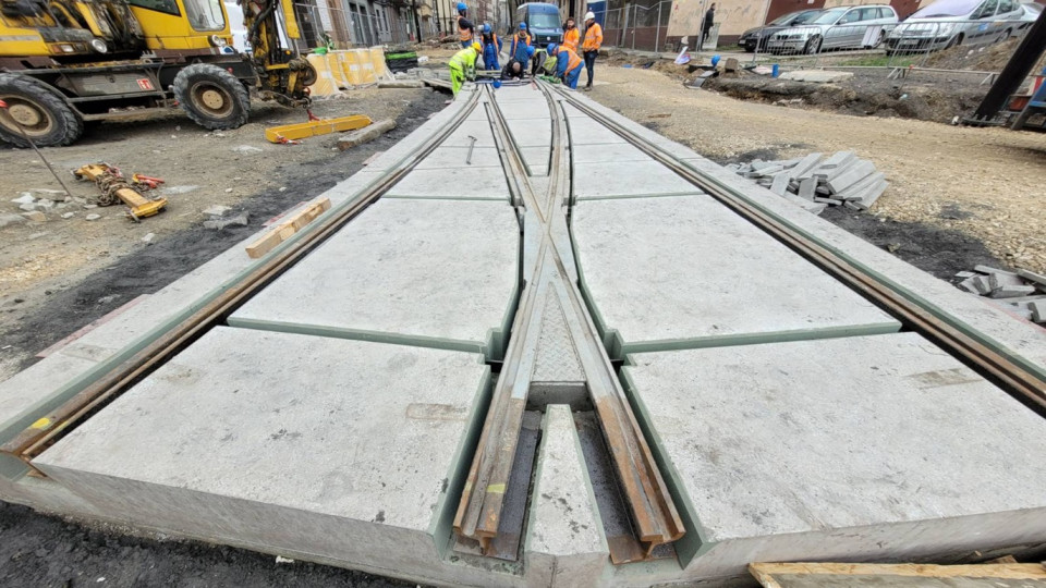 Prefabrykat integrujący podbudowę i nawierzchnię betonową ze stalową konstrukcją tramwajowego rozjazdu pojedynczego ze zwrotnicą ZT-116-3200 R50 został zabudowany w pierwszej połowie kwietnia br. na skrzyżowaniu ulic Powstańców Śląskich i Piekarskiej w Bytomiu, w ramach gruntownej przebudowy tej ostatniej. Pierwsze i tym samym prototypowe prace logistyczno-budowlane trwały około tygodnia, choć docelowy czas ostatecznej zabudowy takiego prefabrykatu ma mieścić się w przedziale 48-72 godzin.